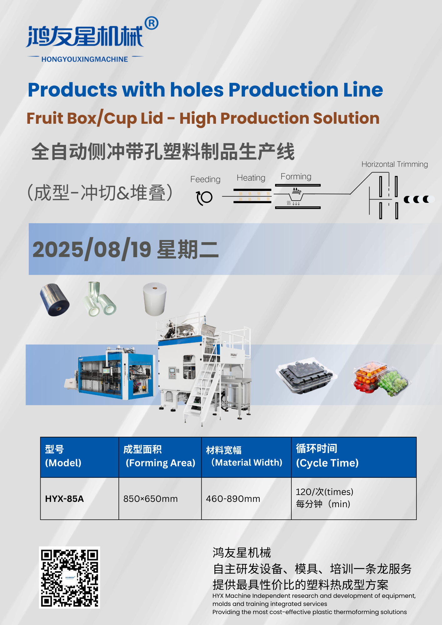 Adatto per la produzione di coperchi per tazze, scatole per fragole e scatole blister con fori laterali e inferiori, macchine per la formazione di blister (note anche come blisteratrici/punzonatrici) sono apparecchiature altamente automatizzate in grado di soddisfare esigenze di confezionamento complesse e trovano particolare impiego nel settore del confezionamento alimentare. Queste macchine non solo supportano la formazione di blister convenzionale, ma creano anche con precisione varie posizioni dei fori, come i fori laterali e inferiori, per soddisfare le diverse esigenze funzionali dell'imballaggio.